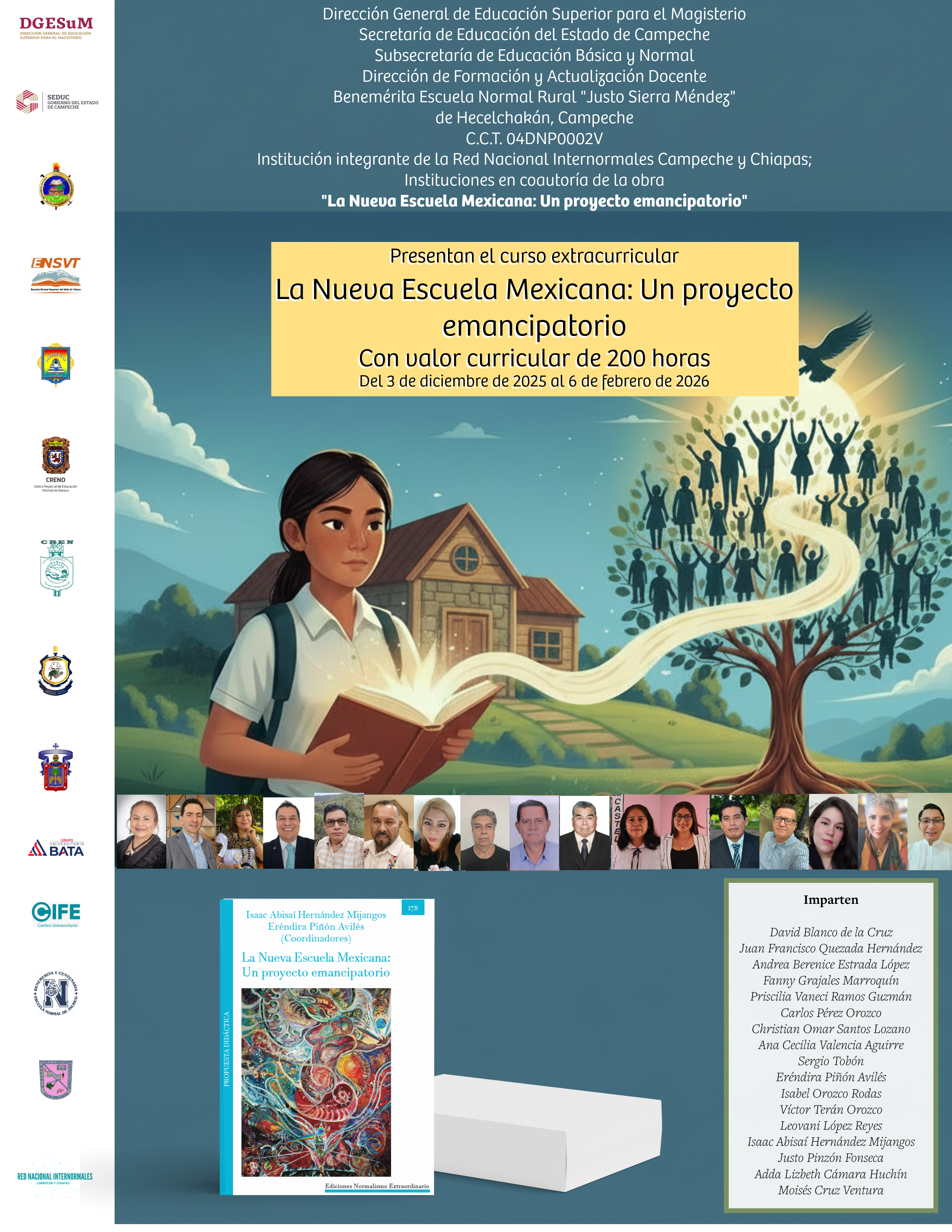 El curso extracurricular “La Nueva Escuela Mexicana: Un proyecto emancipatorio” tiene como propósito fortalecer la apropiación crítica, reflexiva y práctica de los fundamentos, principios, metodologías y herramientas de la Nueva Escuela Mexicana, a través del estudio colaborativo y la sistematización de cada uno de los capítulos del libro, impulsando una praxis educativa transformadora y territorializada.